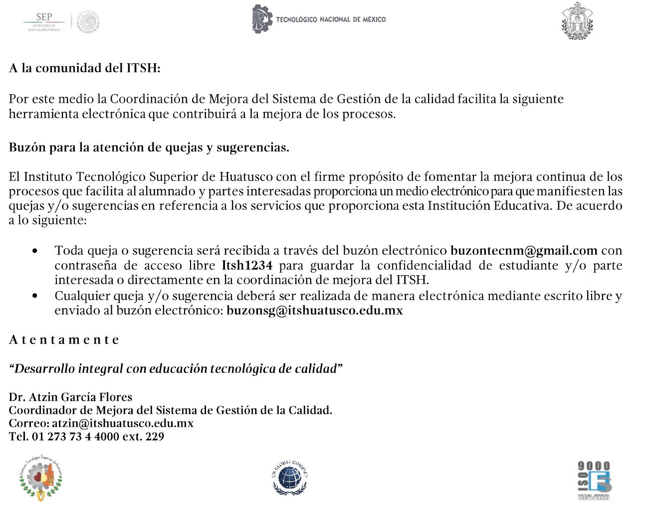 • Toda queja o sugerencia será recibida a través del buzón electrónico Esta dirección de correo electrónico está siendo protegida contra los robots de spam. Necesita tener JavaScript habilitado para poder verlo. con contraseña de acceso libre Itsh1234 para guardar la confidencialidad de estudiante y/o parte interesada o directamente en la coordinación de mejora del ITSH.